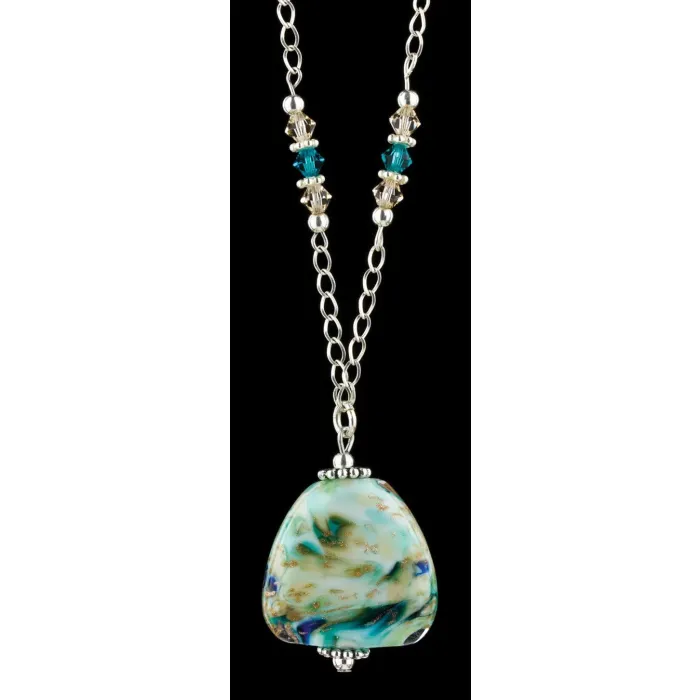 You will be ready to make a fashion statement with this new .925 sterling silver chain Necklace by Fenton Art Glass. This Necklace is 24" long and features a 1" Vasa Murrhina Pendant named "Sand and Sea"! The card for this necklace reads: Warm glittering sand, kissed by the blue green waves.