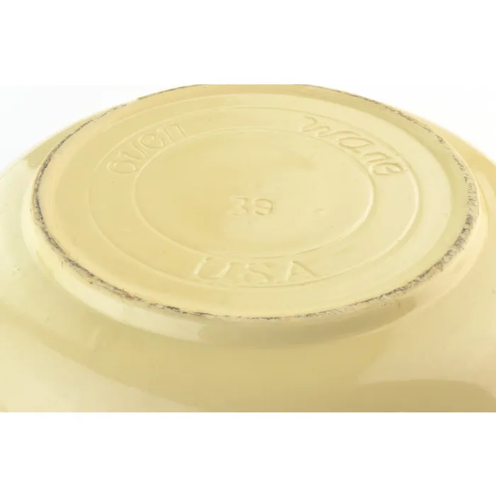 This Watt Pottery Pasta Serving Bowl #39 is 13 1/8" wide and perfect for serving a large Spaghetti dinner. The inner rim of the bowl features a black band and the center of the bowl features the Rio Rose Pattern with a large red rose surrounded by 4 green leaves.